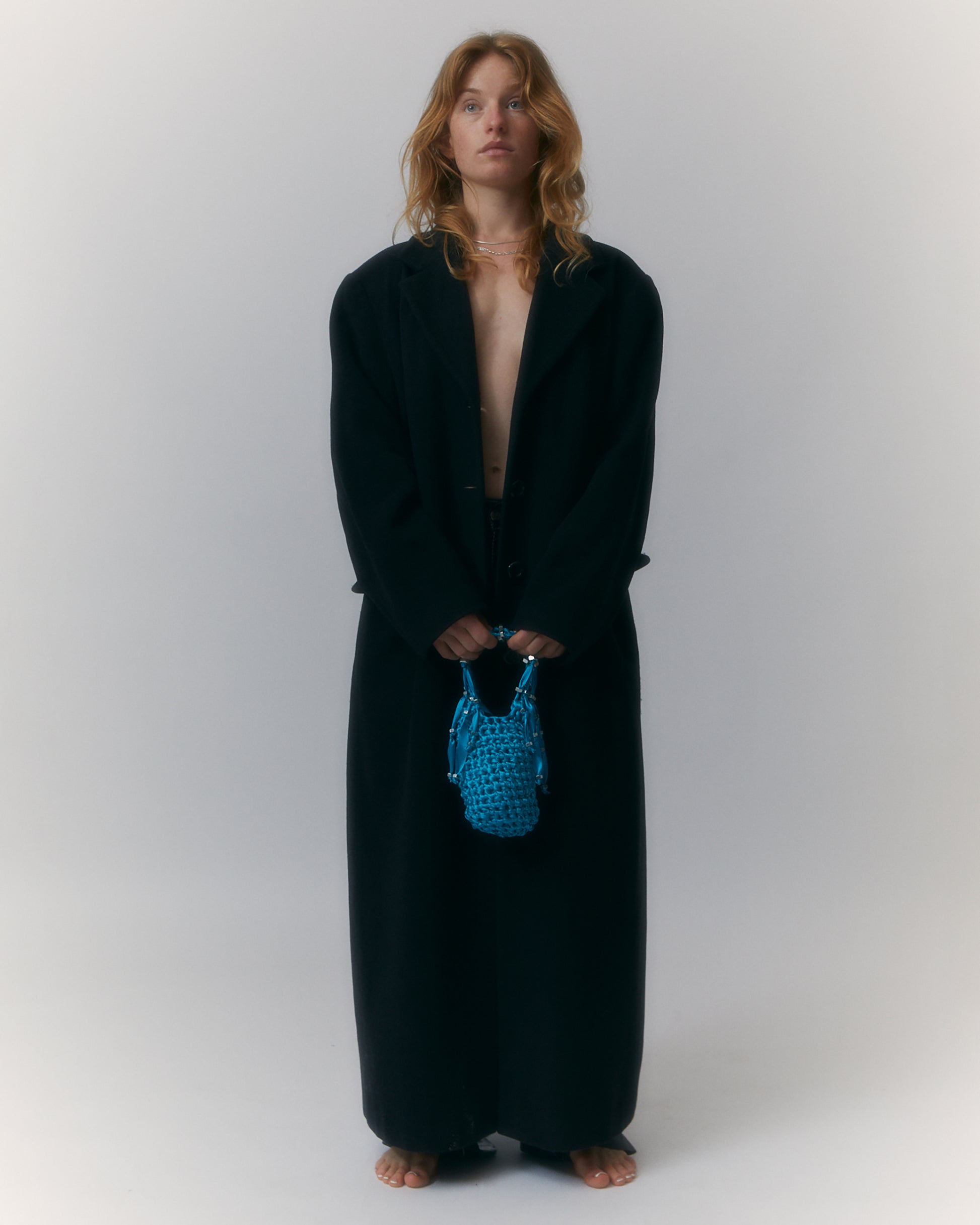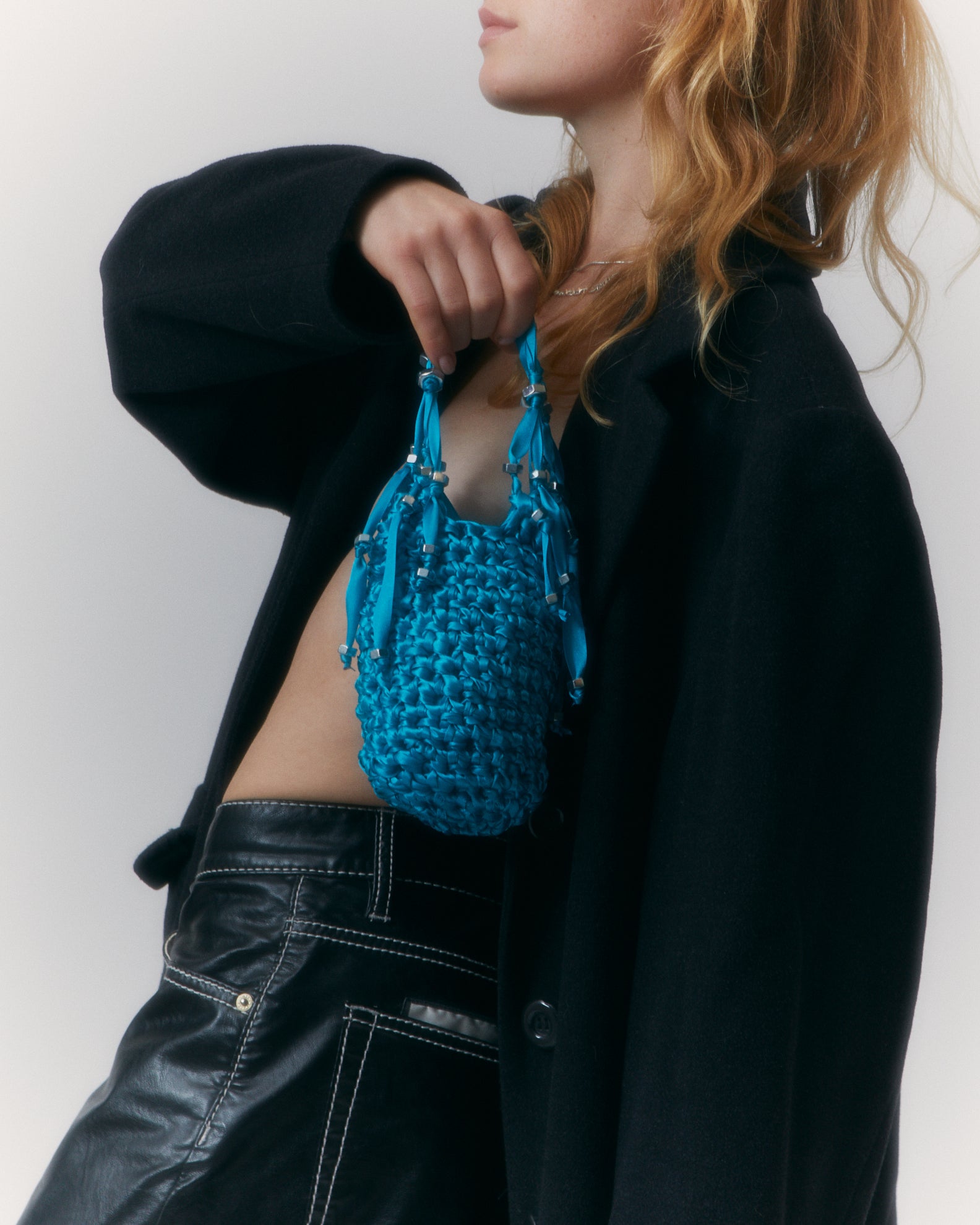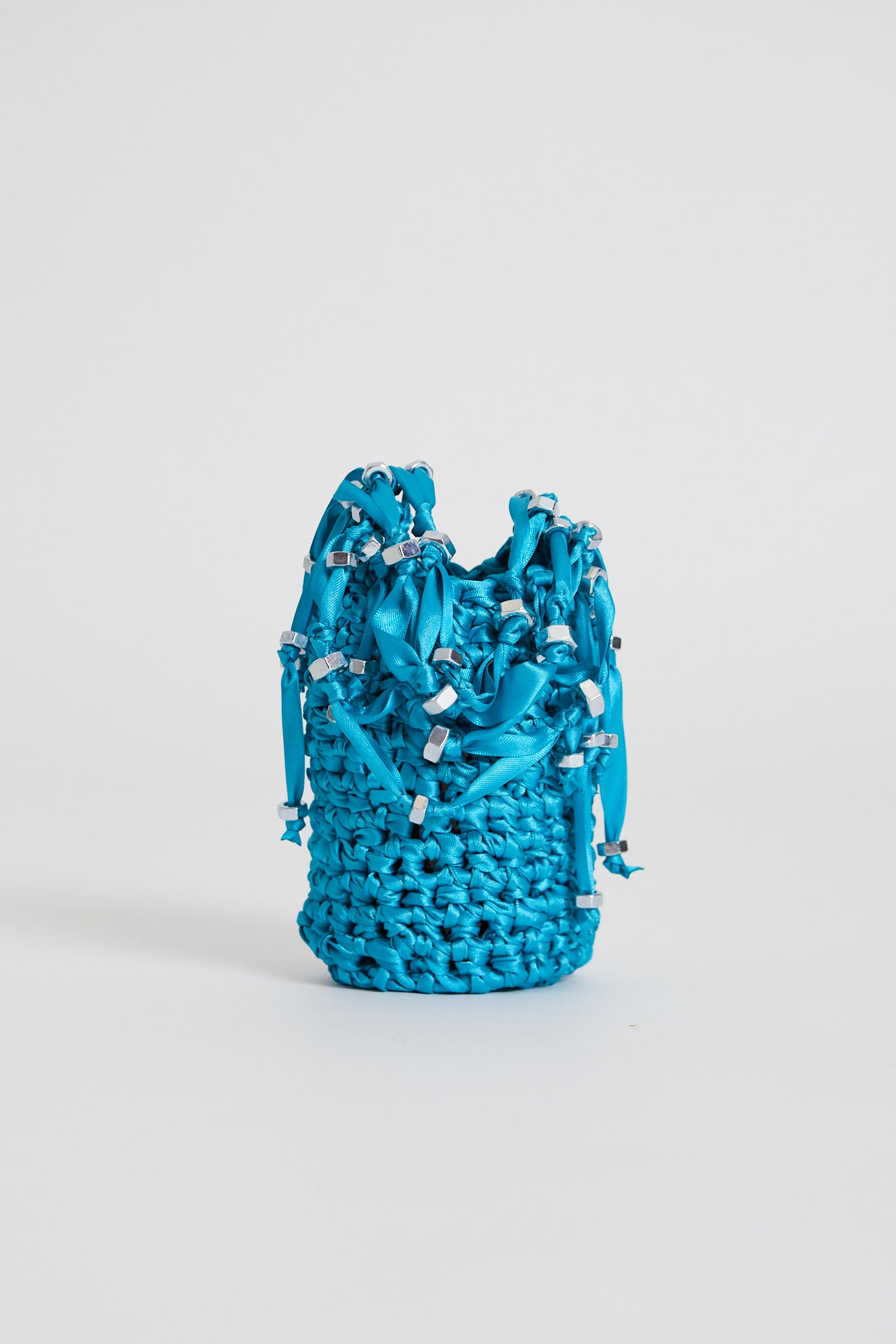 Crochet small bag in satin embedded w. galvanized nuts.